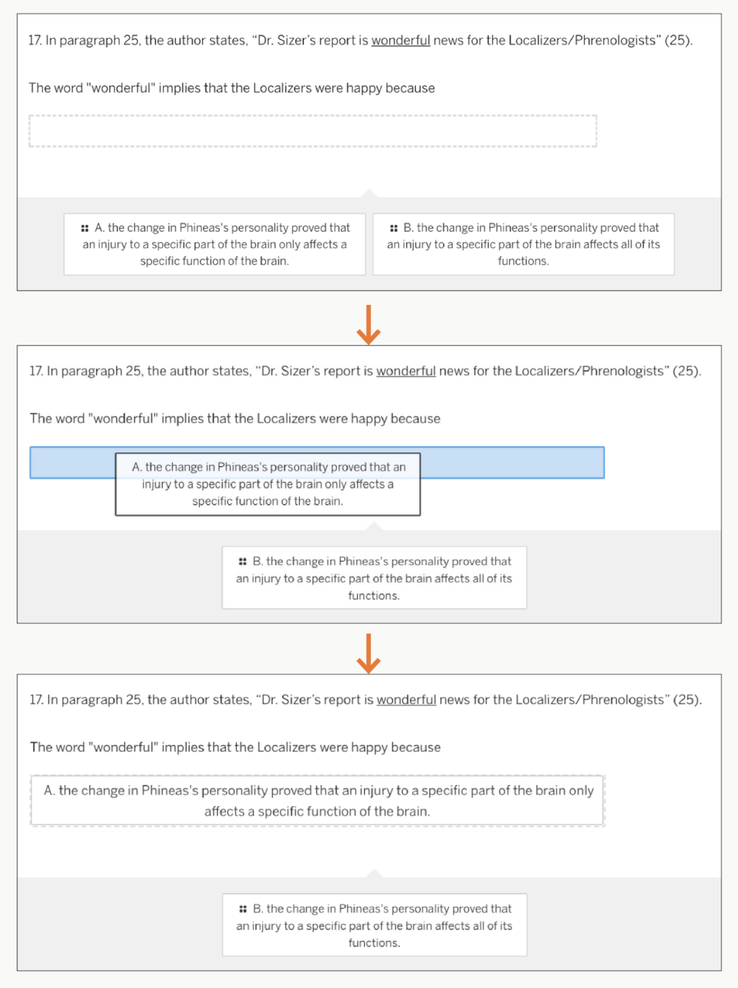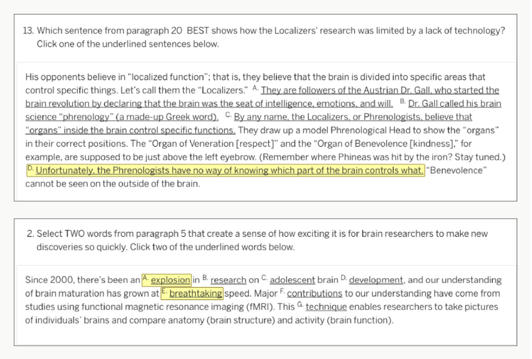 | Token highlight questions These questions require students to select the correct answer(s) by clicking directly on a text excerpt. Students may be prompted to select individual words, phrases, lines, sentences, or paragraphs from a preselected range. Answer choices become highlighted when you hover your cursor over them; to select an answer, click the highlighted text. To deselect an answer, click it again. ![]() |