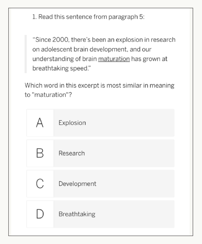 In the first activity section, students read two passages from the unit’s core texts and complete 20 selected response questions. In addition to multiple choice questions, these items include token highlighting and other technology-enhanced items like the ones they may encounter on state and national benchmark assessments. Most students will need 30–40 minutes to complete this section of the assessment.