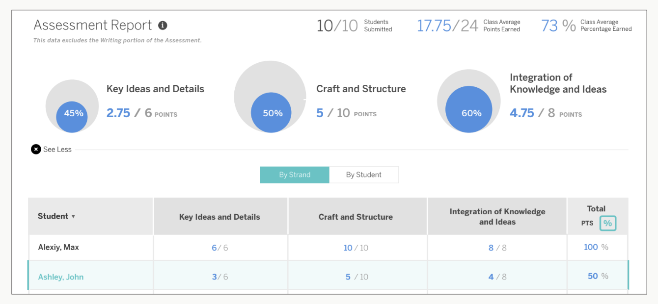 In Reporting, teachers can find information about how students performed on the three key reading strands: Key Ideas and Details, Craft and Structure, and Integration of Knowledge and Ideas.
