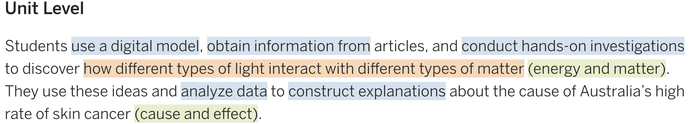 In order to help teachers recognize the three-dimensional structure of every unit, chapter, and lesson in Amplify Science, each unit contains a 3-D Statement document that makes the integration clear. The 3-D Statement document is made all the more effective by color-coding the three dimensions for easy recognition.